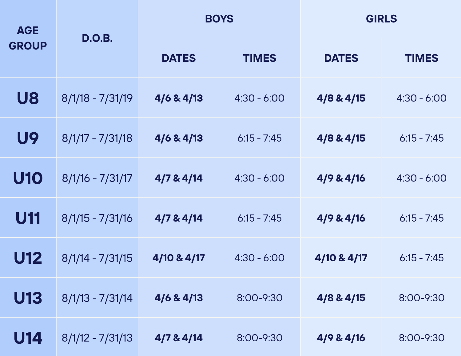 Tryouts will be similar to last year in terms of how they run. The difference is that all players will try out for the 2026-2027 Age Group change. This might mean that some teammates are trying out on different days. All players are expected to attend any team training held that week. Our staff will determine whether a session needs to be combined with another group.