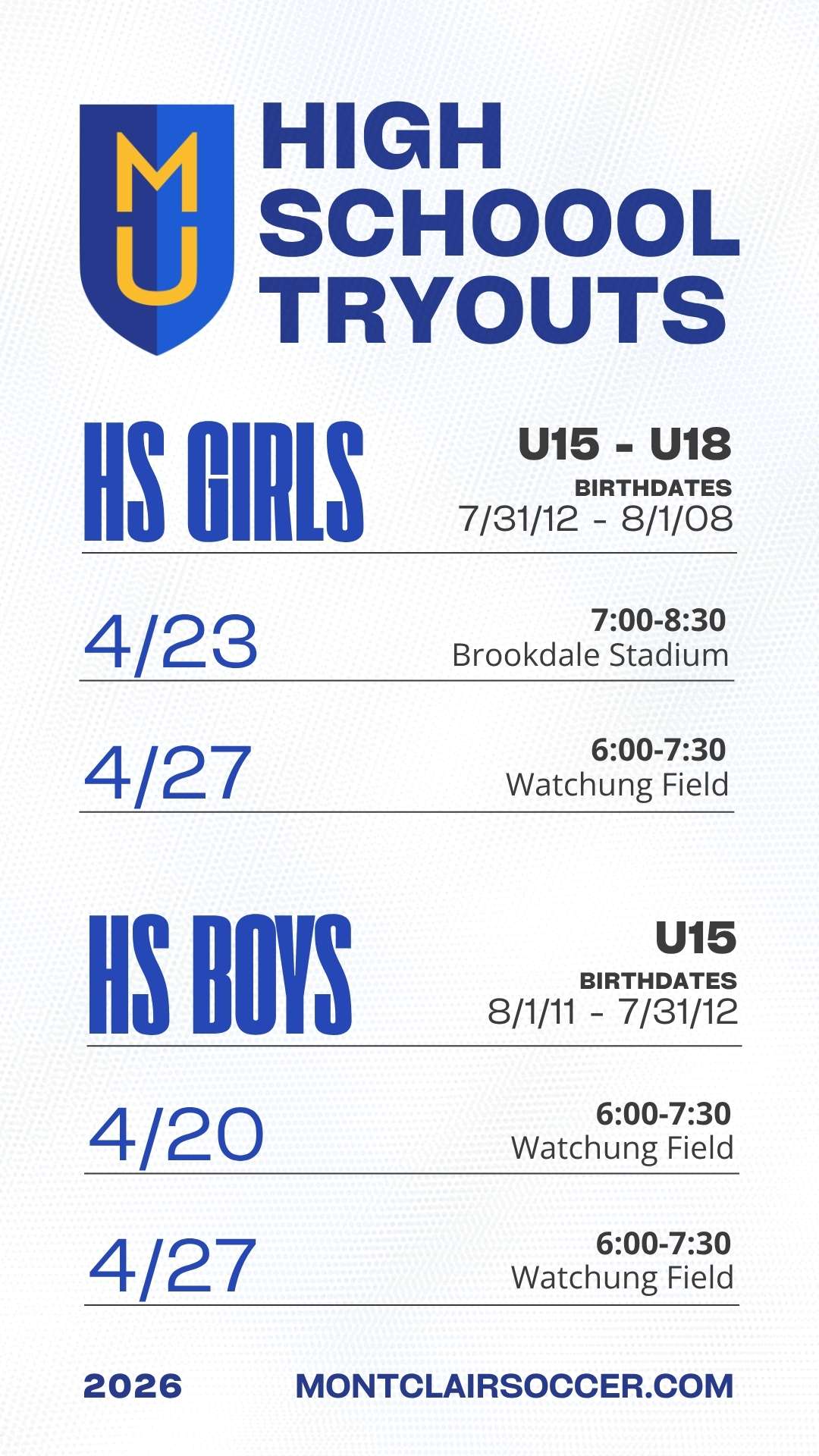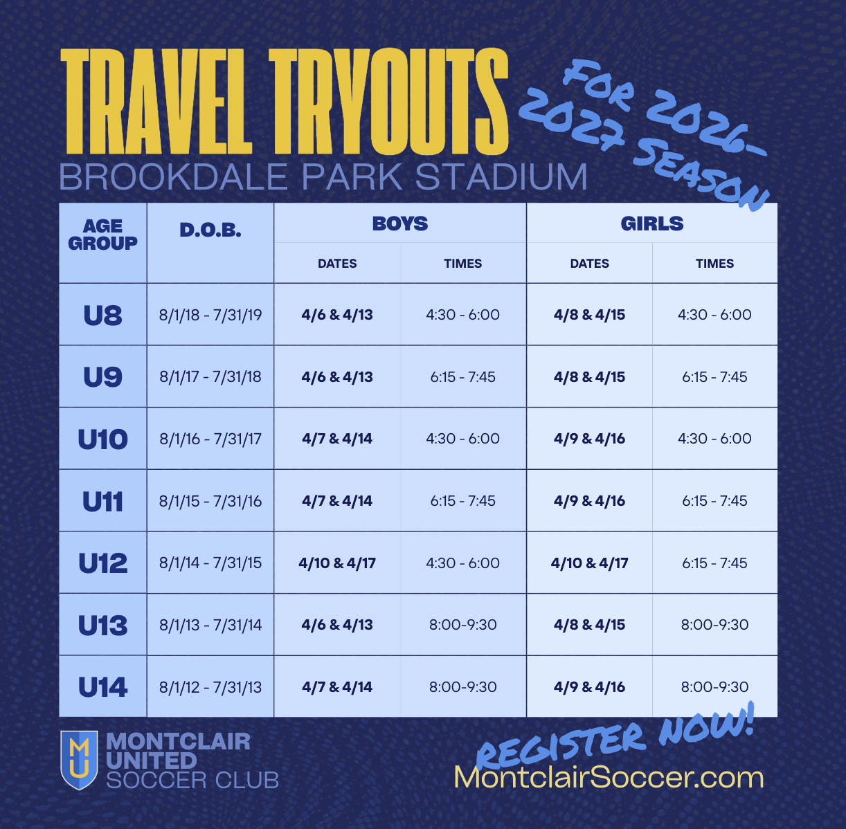Location: All tryouts will take place at Brookdale stadium turf (map)